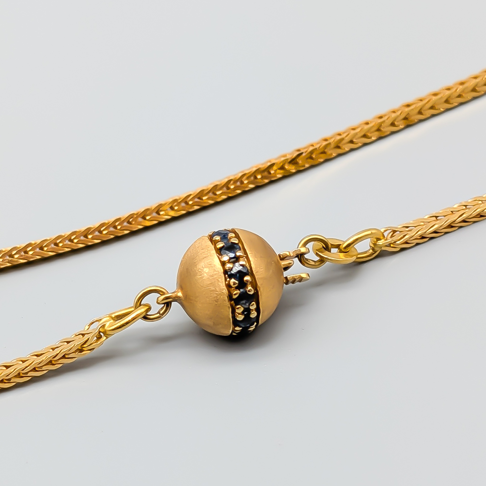 Necklace, Gold, Foxtail, 21K, 25.99g (Of which precious metal: approx. 21.99g), Length: 81.5cm, Width: 1.8mm, Good condition. Clasp in 18K gold with Sapphires.